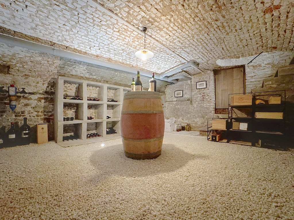 Une cave à vin rustique et chaleureuse, avec des murs en pierre, un plafond voûté, un grand barrel en bois au centre, entouré de bouteilles élégantes, de caisses en bois, et un éclairage doux qui met en valeur l’ambiance vintage et authentique.