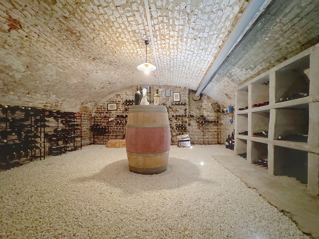 Une cave à vin rustique au charme ancien avec un plafond voûté en briques un grand tonneau en bois au centre des étagères métalliques bien organisées avec des bouteilles de vin et un sol en gravier blanc évoquant tradition et élégance