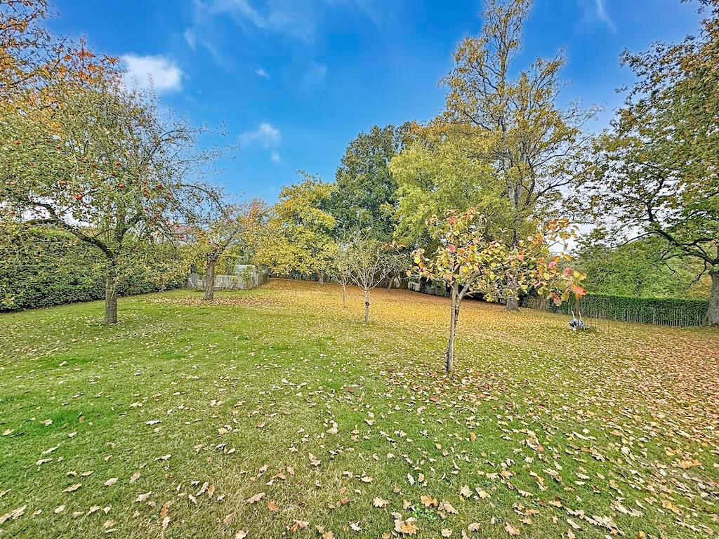 Un jardin paisible en automne, avec une pelouse verdoyante, des feuilles colorées par la saison, des arbres aux feuillages jaunes et orangés, une haie verte en arrière-plan, sous un ciel bleu clair avec des nuages doux, évoquant la sérénité dune journée dautomne.