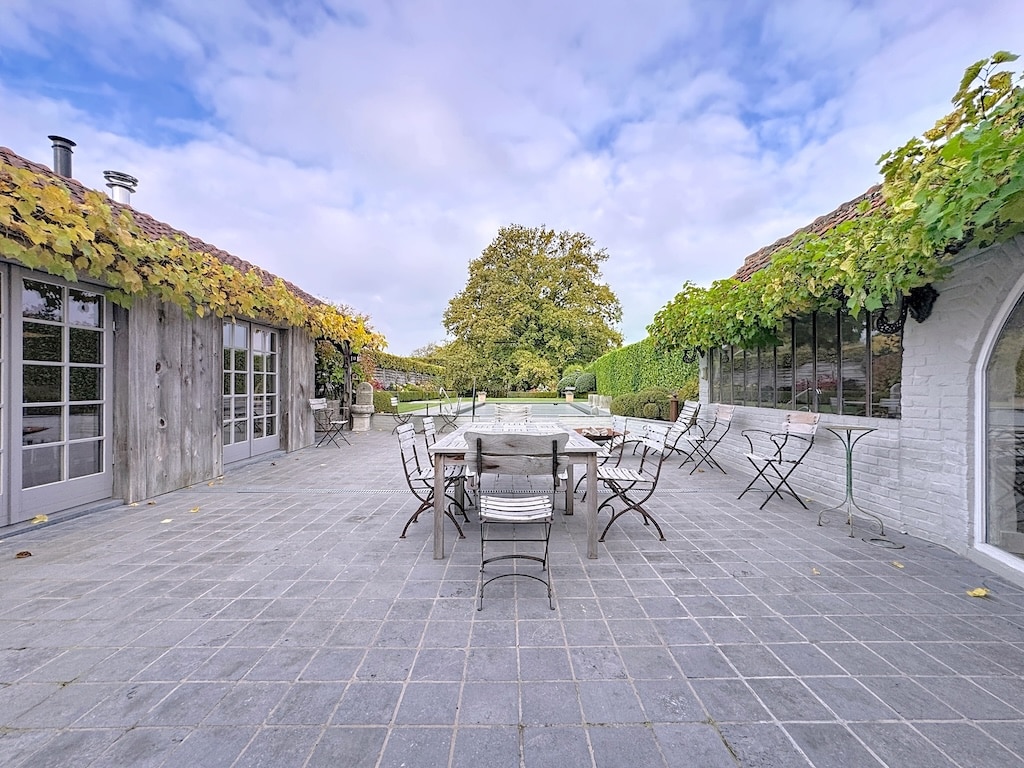 Un patio rustique entouré de bâtiments en bois couvrant une terrasse pavée avec des chaises en métal et une grande table Des vignes grimpantes un arbre ombrageant la scène et un jardin lush créent une ambiance paisible et chaleureuse