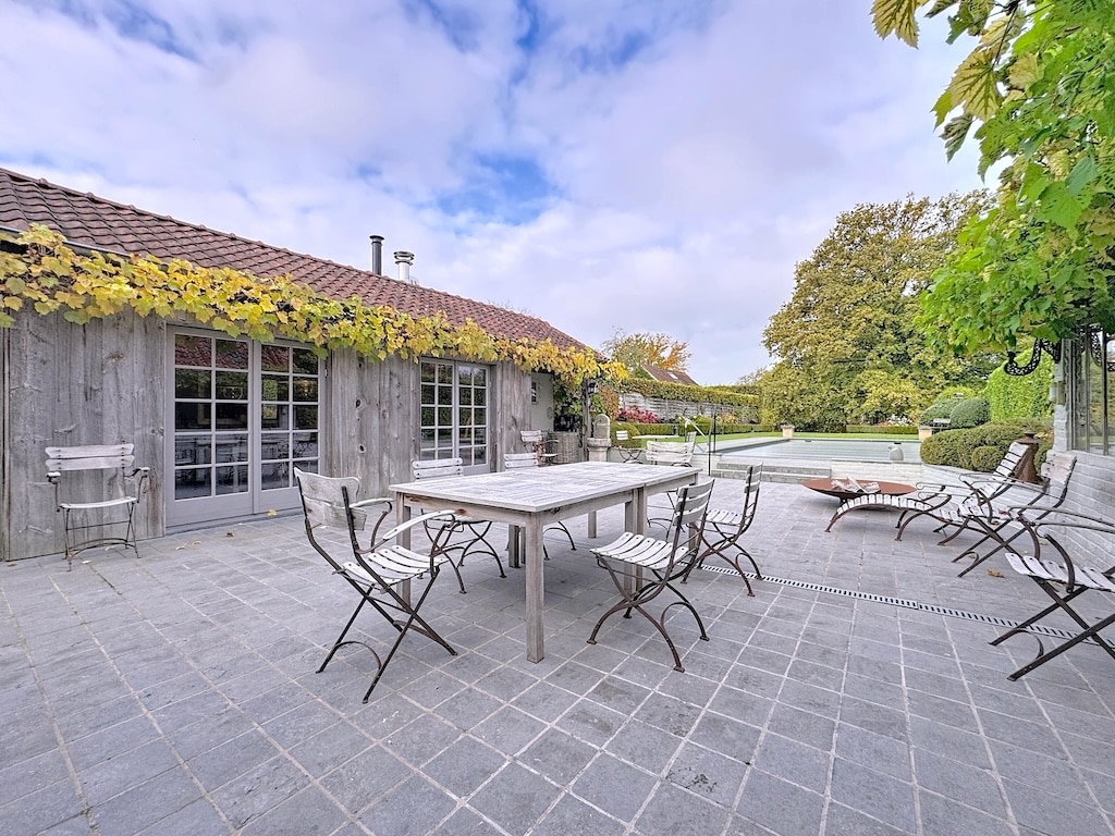 Un patio rustique bordé de végétation avec une grande table en bois clair entourée de chaises en métal sous une treille de vignes vertes La pierre grise et le bois patiné créent une ambiance chaleureuse et sereine idéale pour se détendre en pleine nature