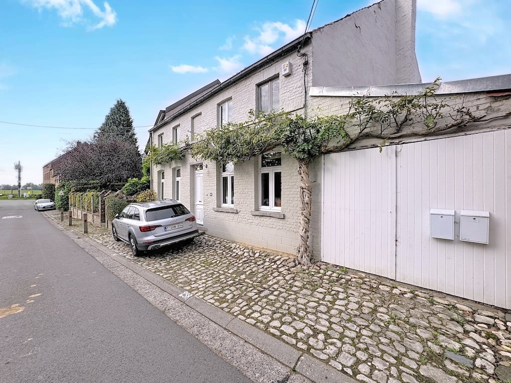 Une maison de campagne charmante, à façade en pierre claire, décorée dune vigne lush, avec une voiture argentée stationnée sur une allée en pavés. Le cadre paisible est agrémenté de verdure, d’une clôture blanche et d’un ciel légèrement nuageux.