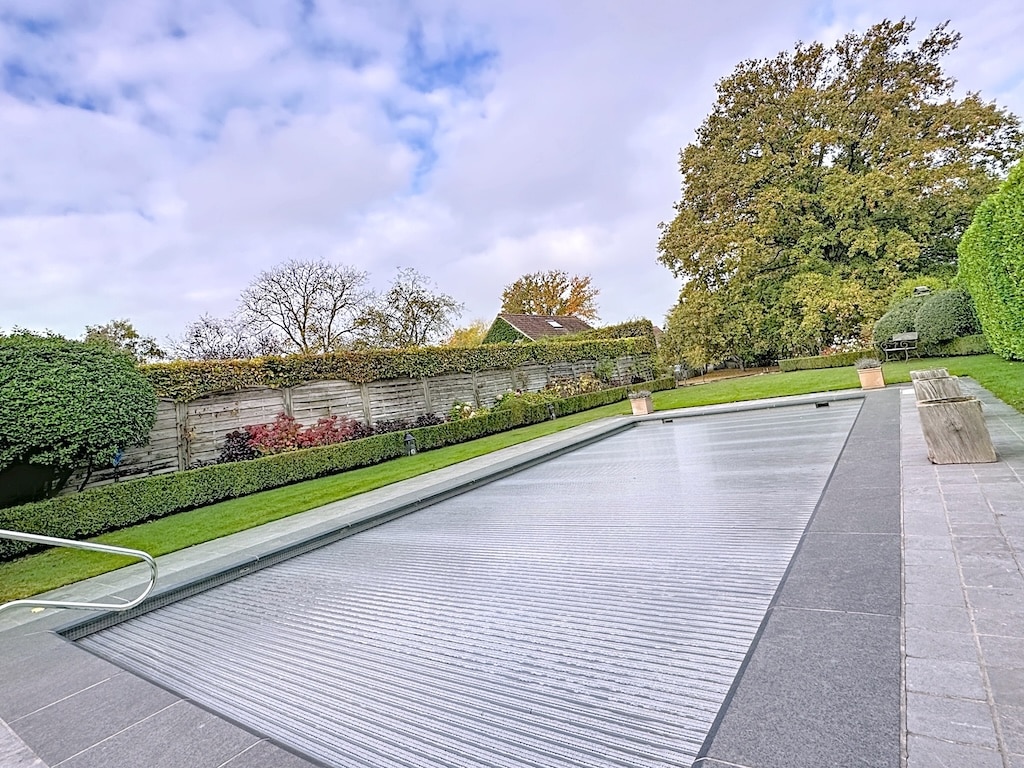 Une piscine moderne aux lignes épurées, entourée d’un jardin soigné avec des buissons verts, des arbres aux feuilles changeantes et un mur en pierre rustique, créant un espace relaxant et harmonieux sous un ciel nuageux.