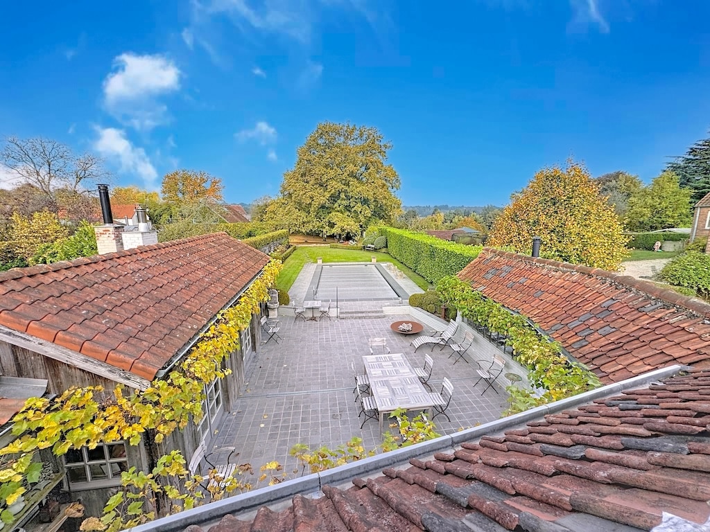 Retraite champêtre avec piscine, cour pavée, mobilier de jardin, bâtiments en toiture en tuiles rustiques, arbres en automne, jardins soignés et paysage apaisant, offrant un espace de détente dans un cadre naturel et charmant.