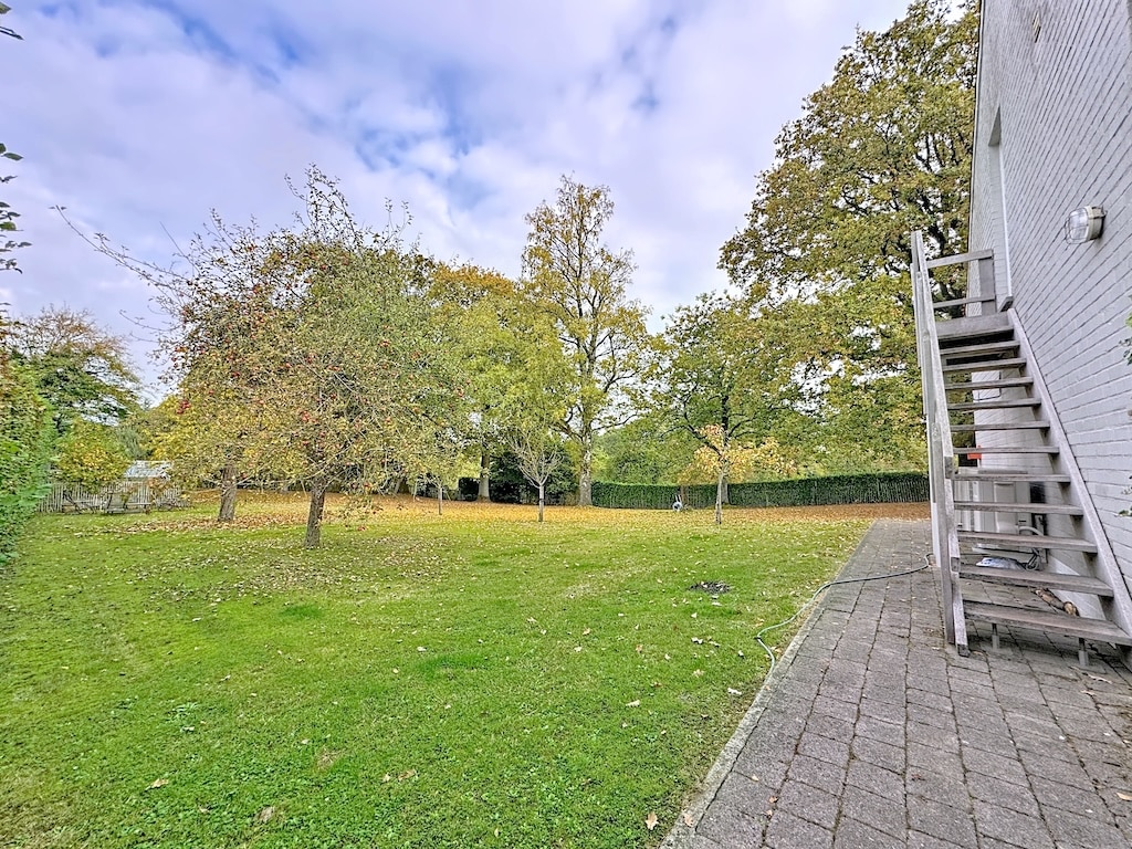 Jardin tranquille avec pelouse arbres dautomne escalier vers maison blanche et haie verte