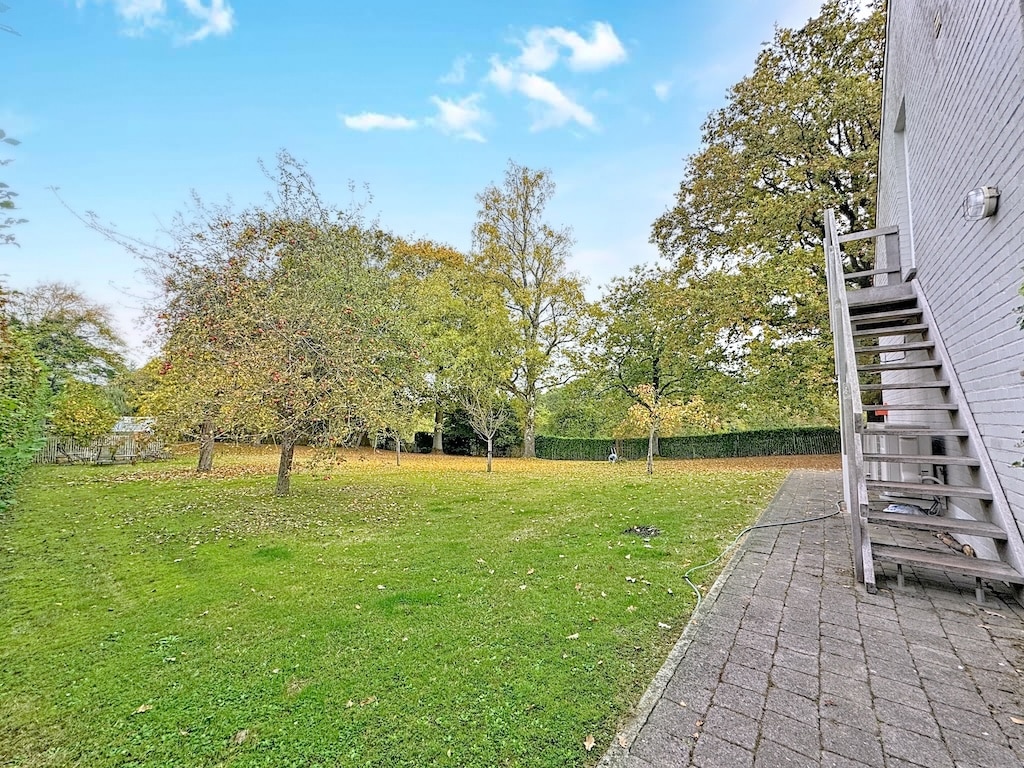 Un jardin paisible avec une pelouse verte des arbres aux feuillages dautomne un chemin pavé menant à une bâtisse blanche avec un escalier en bois sous un ciel légèrement nuageux créant un espace serein idéal pour la détente