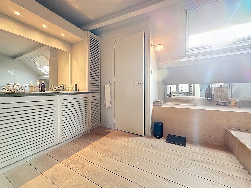 Une salle de bain moderne et lumineuse avec un parquet en bois clair un vanity épuré des rangements organisés un éclairage doux un coin détente avec un tapis noir et un miroir massif reflétant la lumière naturelle dune fenêtre de toit