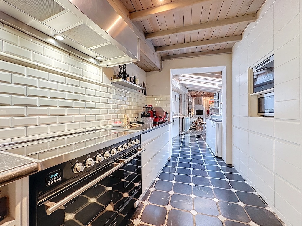 Une cuisine moderne et chaleureuse avec des carreaux hexagonaux noirs, des armoires blanches, un plan de cuisson en acier inoxydable, une hotte intégrée, des poutres en bois au plafond et un décor lumineux, créant un espace fonctionnel et accueillant pour la famille.