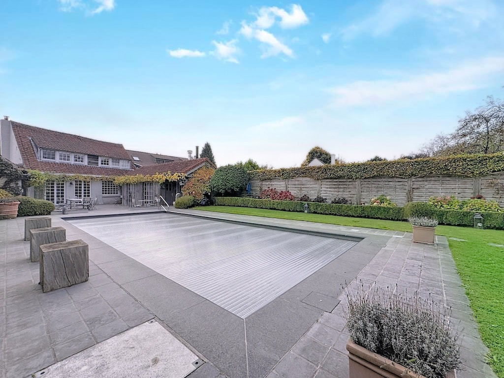 Un jardin de rêve avec une piscine couverte entourée dune terrasse en pierre dun jardin verdoyant et coloré sous un ciel bleu doux La maison chaleureuse en arrière plan complète cet espace parfait pour la détente et la convivialité