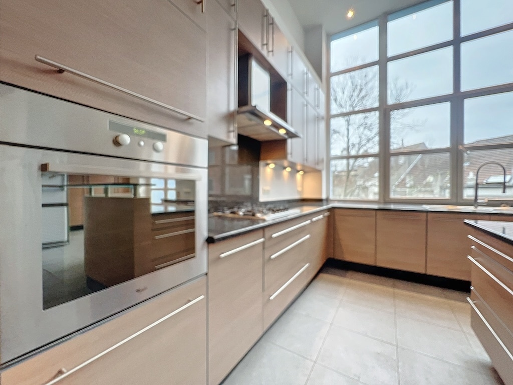 Une cuisine moderne lumineuse avec des meubles en bois clair un comptoir noir contrastant un four en inox intégré une hotte sleek de larges fenêtres laissant entrer la lumière naturelle et offrant une vue verdoyante sur un sol gris clair