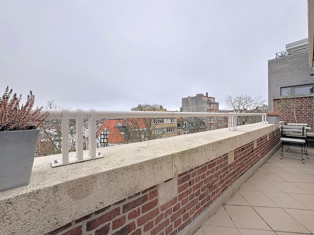 Balcon urbain paisible avec mobilier simple vue sur des bâtiments variés sous un ciel gris une petite jardinière avec peu de végétation et une ambiance calme idéale pour la détente en ville