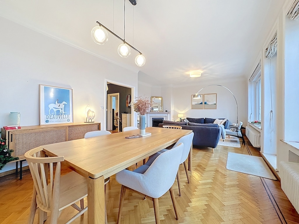 Un salon moderne et chaleureux avec un espace repas lumineux canapé bleu mobilier en bois clair grande baie vitrée décoration élégante et contraste de textures créant une ambiance conviviale et design