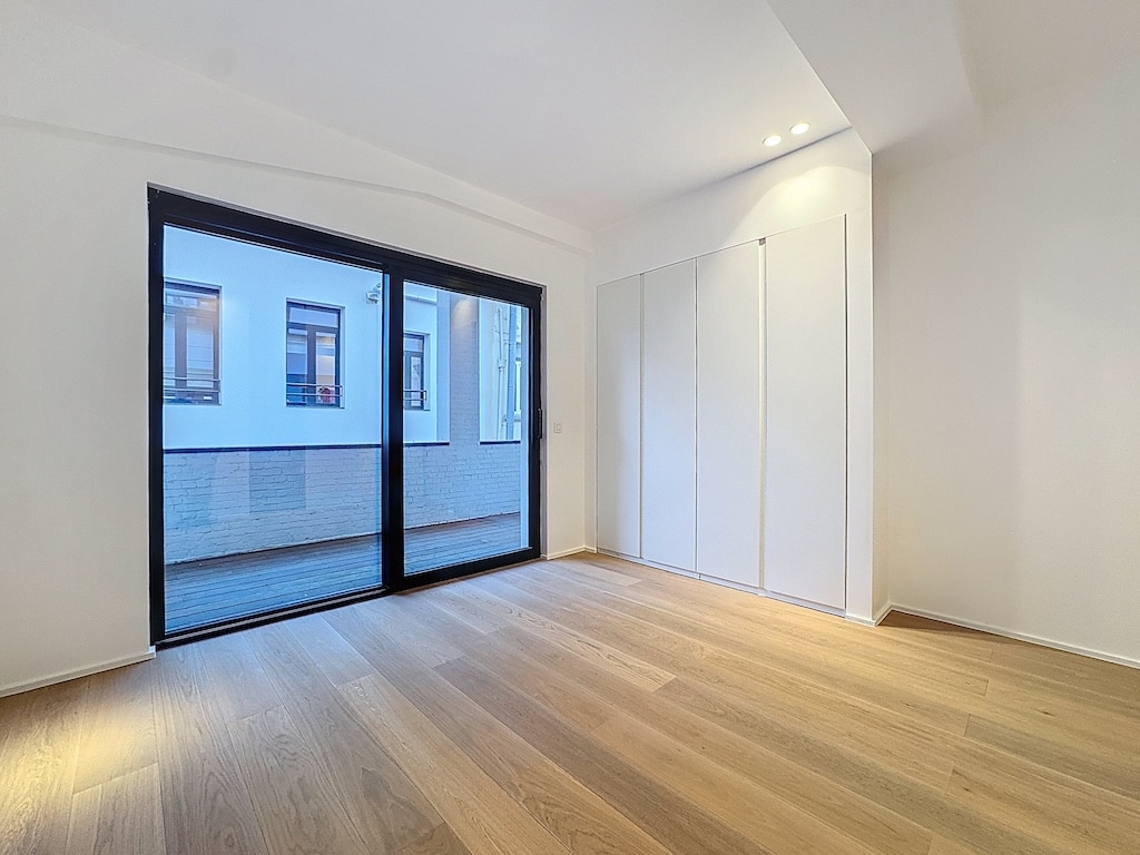 Un salon moderne et minimaliste avec un sol en bois clair murs blancs et grandes portes vitrées menant à une terrasse lumineuse La pièce est chaleureuse épurée avec un éclairage intégré idéale pour relaxation ou travail dans un cadre contemporain
