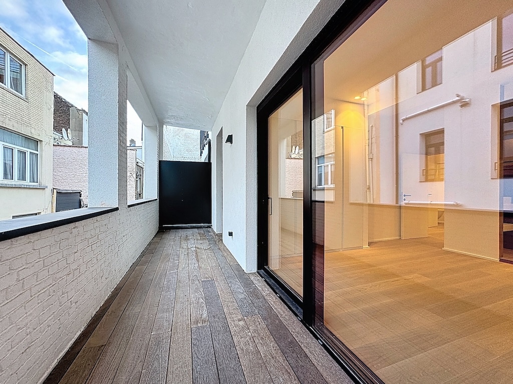 Balcon moderne lumineux avec sol en bois grandes fenêtres vitrées idéal pour détente et vie urbaine