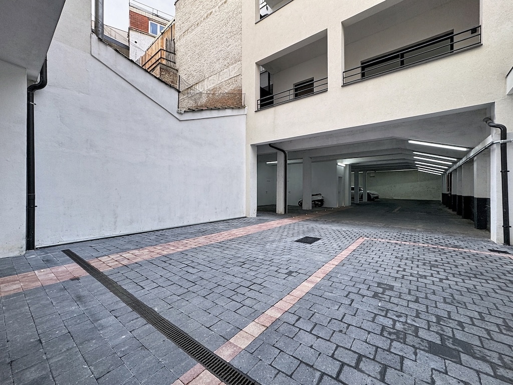 Un parking urbain moderne avec sol en pavés gris éclairé naturellement par des fenêtres offrant un espace bien organisé avec barrières blanches rambarde en métal et une pente vers une grille de drainage