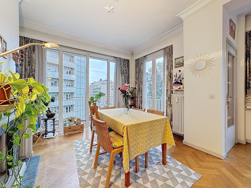 Coin cuisine cosy avec table jaune, chaises en bois, plantes vertes, grande baie vitrée offrant une vue urbaine, décor floral et miroir soleil, créant une ambiance chaleureuse et lumineuse dans un espace alliant nature et vie citadine.