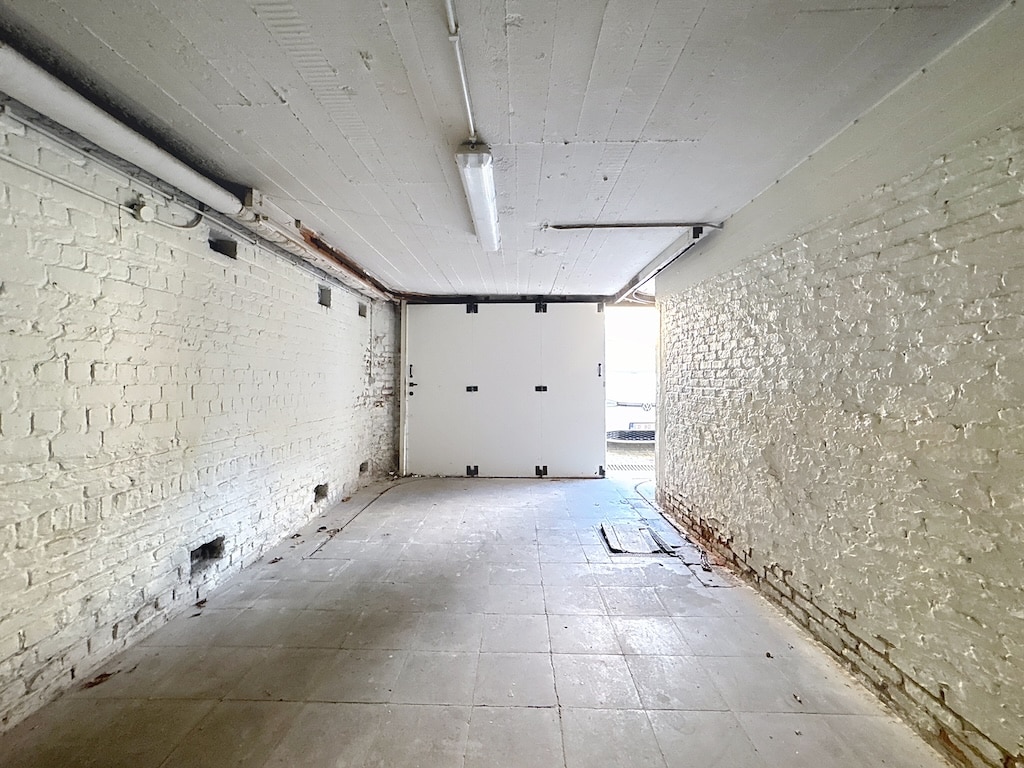 Passage étroit en intérieur murs en briques blanches usées éclairage fluorescent porte blanche légèrement entrouverte sol carrelé sale Atmosphère minimaliste industrielle évoquant un espace utilitaire chargé dhistoire