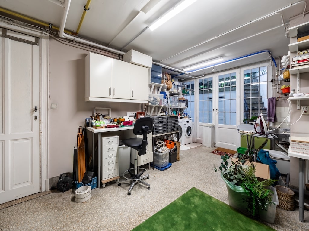 Garage spacieux avec espace de travail plantes lumière naturelle et rangement organisé