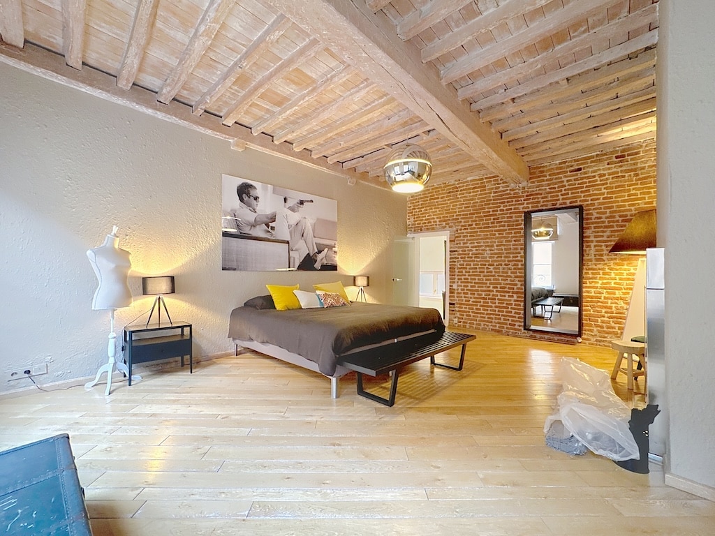 Chambre élégante avec poutres mur en briques lit coloré et décoration minimaliste