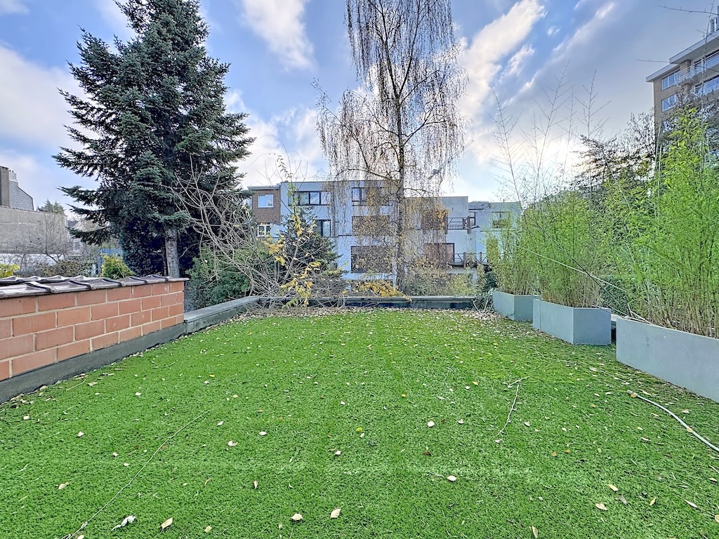Jardin urbain paisible avec pelouse arbre jardinières modernes et bâtiments en arrière plan