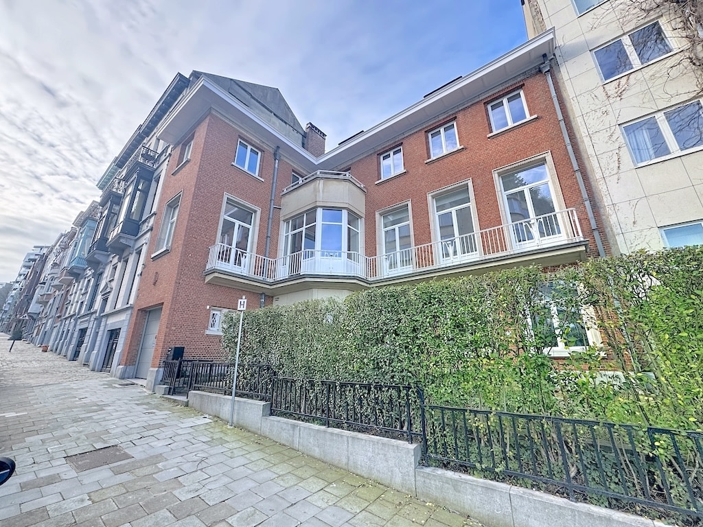 Maison résidentielle mêlant architecture classique en briques rouges et éléments modernes, avec large fenêtres, balcon en verre, jardin secret entouré de haies verdoyantes, dans un quartier calme où voisinage traditionnel et contemporain cohabitent harmonieusement.