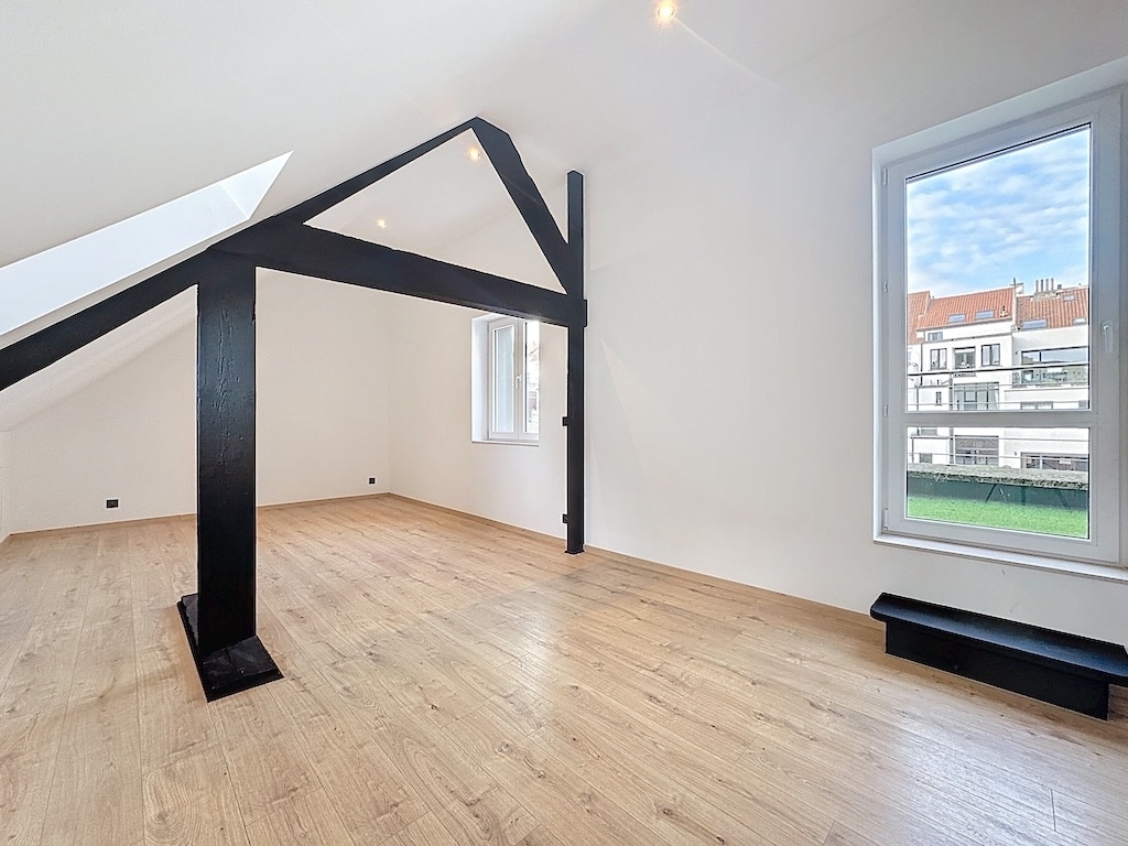 Intérieur lumineux et moderne avec un plafond en pente de grandes fenêtres offrant une vue panoramique des poutres noires apparentes un sol en bois clair et des murs blancs créant un espace ouvert élégant et versatile
