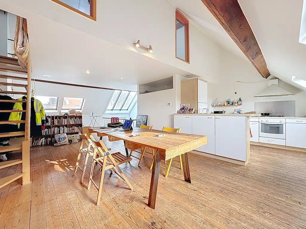 Ideally located between the Saint-Antoine and La Chasse districts, this studio apartment with mezzanine has a total surface area of ± 70 m² (according to PEB) with terrace, on the 3ᵉ floor of a well-maintained 1908 building, WITHOUT LIFT. It is composed as follows: entrance by staircase, terrace of ± 7 m², living room with dining room of ± 48 m², super-equipped kitchen of ± 10 m², bathroom with toilet of ± 5 m². Mezzanine: 17 m² open-plan bedroom and 5 m² additional space for dressing room, office or second bedroom.