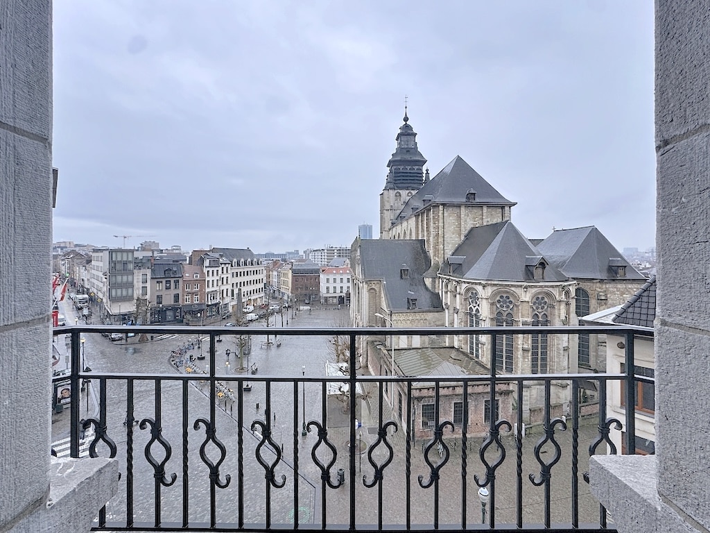 Vue depuis un balcon sur une ville historique aux bâtiments traditionnels et une haute flèche, sous un ciel gris menaçant. La scène est calme, avec des reflets dans les flaques, évoquant une atmosphère mélancolique et charmante.