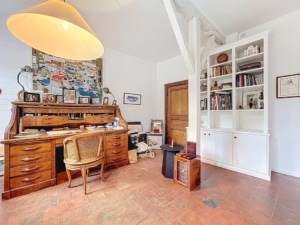 Un bureau chaleureux mixant style vintage et moderne avec un bureau en bois ancien une bibliothèque blanche remplie de livres et dobjets déco un mur de photos et œuvres dart le tout sur un sol en terre cuite baigné de lumière naturelle