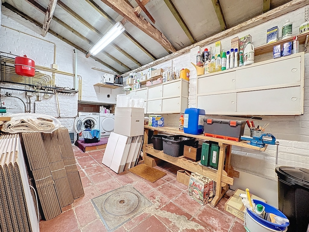 Une buanderie rustique et pratique avec machine à laver sèche linge étagères de rangement plan de travail en bois pour plier le linge sols en brique et carrelage éclairée par un filet lumineux alliant organisation et charme chaleureux