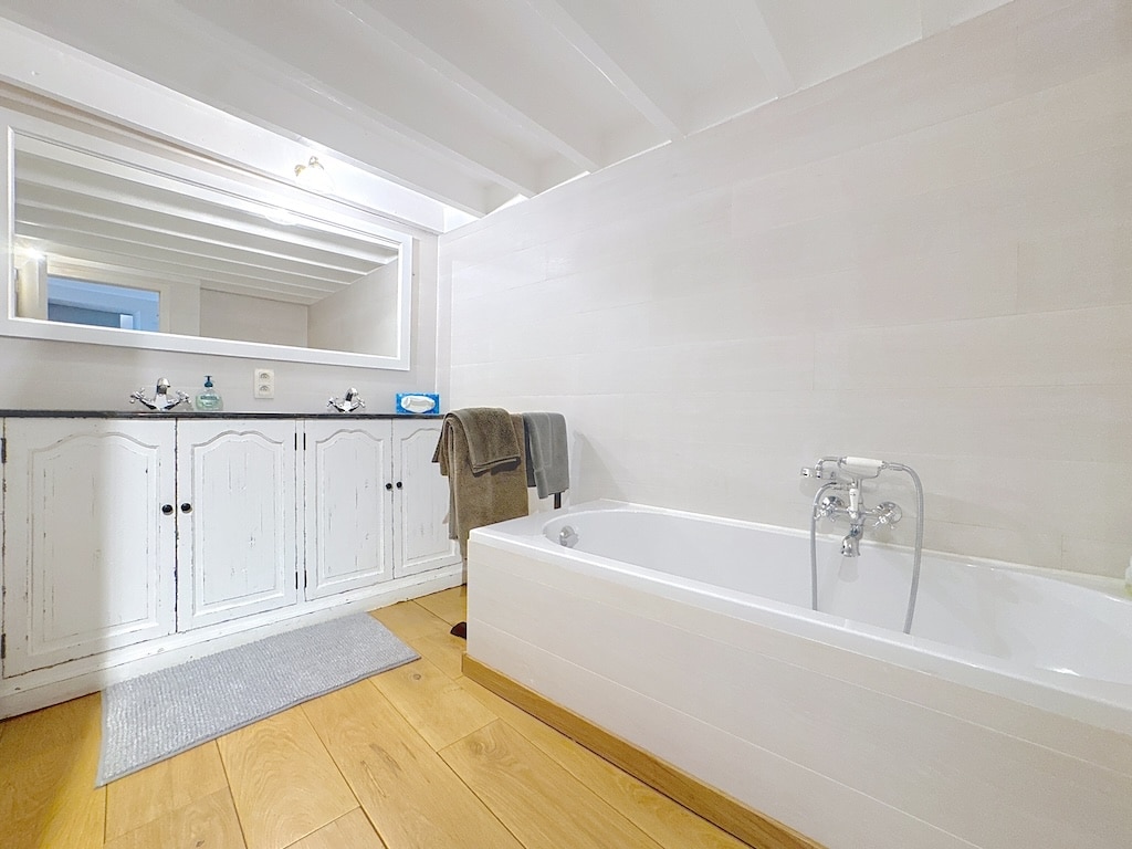 Une salle de bain moderne et lumineuse avec une baignoire minimaliste, un miroir grand format au-dessus d’un vanity élégant, un tapis doux, et des détails en bois chaud, créant une ambiance relaxante et raffinée.