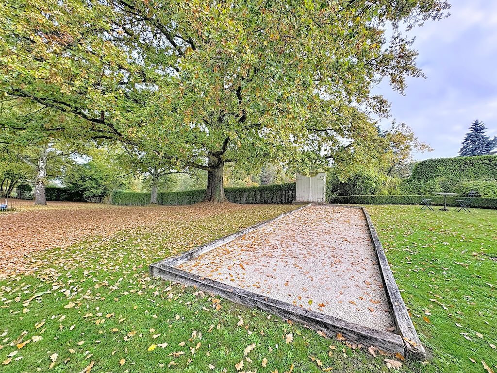 Un parc bucolique en automne avec une grande pelouse un arbre aux couleurs orangées une aire de jeux en sable bordée de bois une haie bien taillée et une petite structure en arrière plan offrant un cadre paisible pour la détente et les activités en famille
