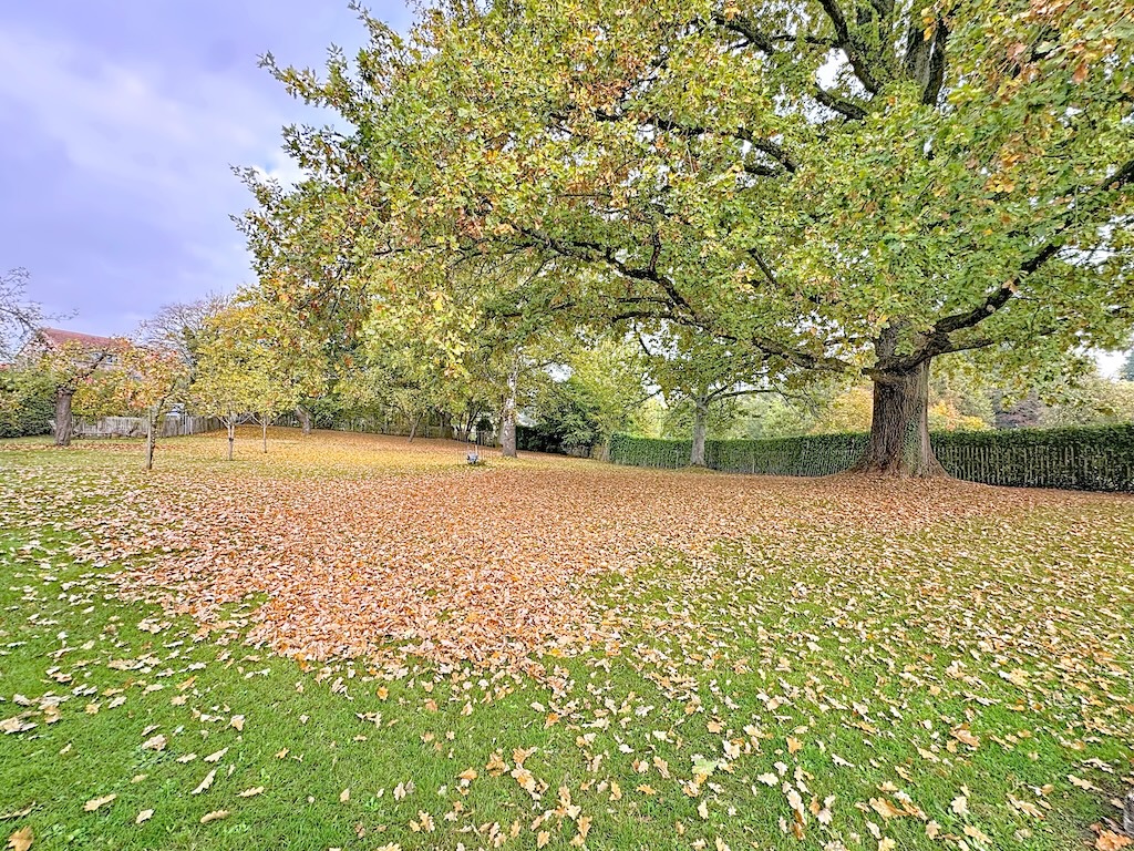 Un parc automnal paisible avec un grand arbre vert feuillu dont les feuilles commencent à changer de couleur tombant doucement sur la pelouse verte et les sentiers environnants sous un ciel nuageux doux