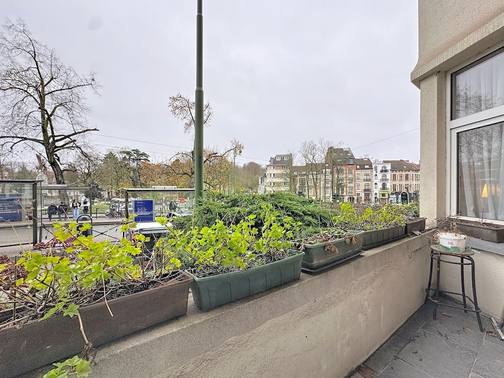 Un balcon verdoyant dominant une rue urbaine, décoré de plantes fraîches en pots, avec des bâtiments anciens en arrière-plan sous un ciel nuageux d’automne, créant une atmosphère paisible et charmante en pleine ville.
