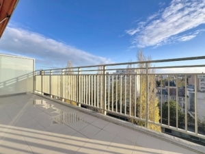 Un balcon moderne offrant une vue panoramique sur la ville avec un sol en carreaux brillants une rambarde en verre et des arbres aux feuillages automnaux Latmosphère est calme baignée de lumière naturelle idéale pour la détente et la contemplation urbaine