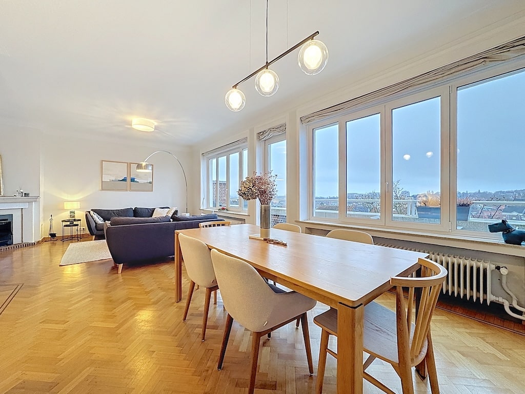 Une salle à manger moderne et lumineuse avec grande baie vitrée, table en bois avec chaises élégantes, vase de fleurs séchées, et un coin salon cosy avec canapé bleu marine et tapis texturé, offrant une vue urbaine chic.