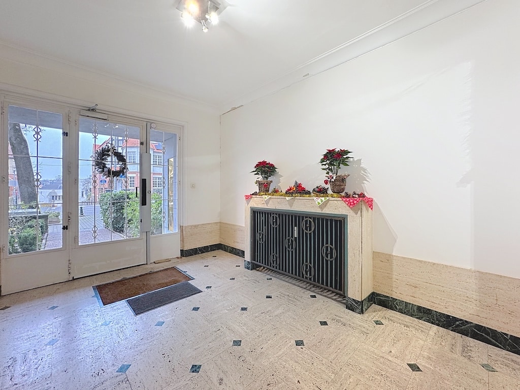 Entrée lumineuse avec portes en verre décoration florale et ambiance chaleureuse accueillante