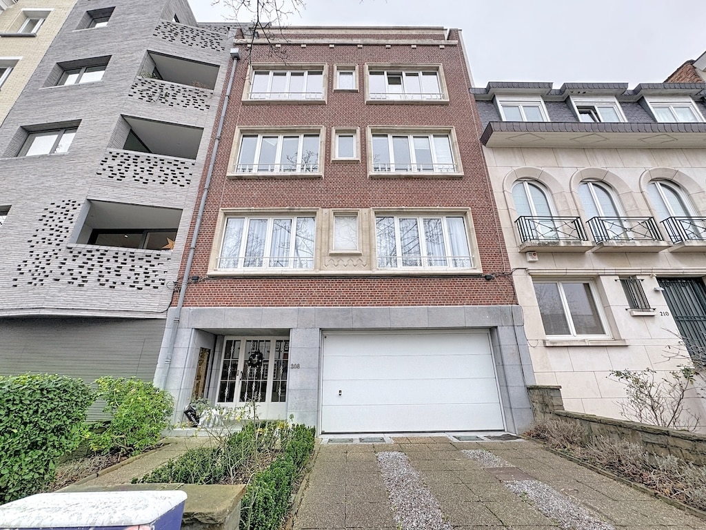 Une harmonie architecturale entre tradition et modernité une bâtisse en briques rouges aux fenêtres rectangulaires contrastée par un immeuble contemporain en béton entourée de jardins soignés et dun chemin pavé menant à un garage