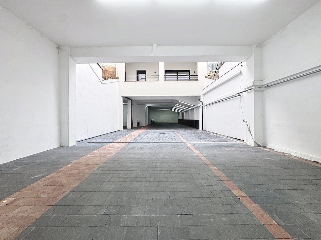 Espace de stationnement moderne lumineux avec murs blancs sol en carrelage gris et grandes fenêtres