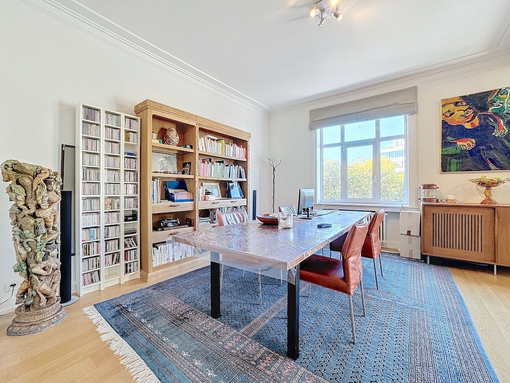 Bureau moderne lumineux avec table en bois chaises orange bibliothèque œuvre dart colorée et tapis design