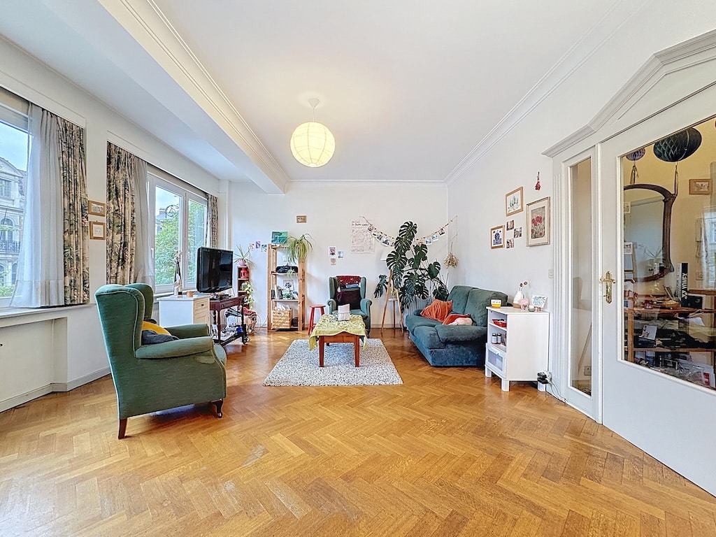 Un salon cosy avec un parquet en bois poli, un canapé bleu et un fauteuil vert, décoré de coussins colorés. La pièce est baignée de lumière naturelle, avec des murs neutres, des tableaux, une plante d’intérieur et une télévision, créant une ambiance accueillante.