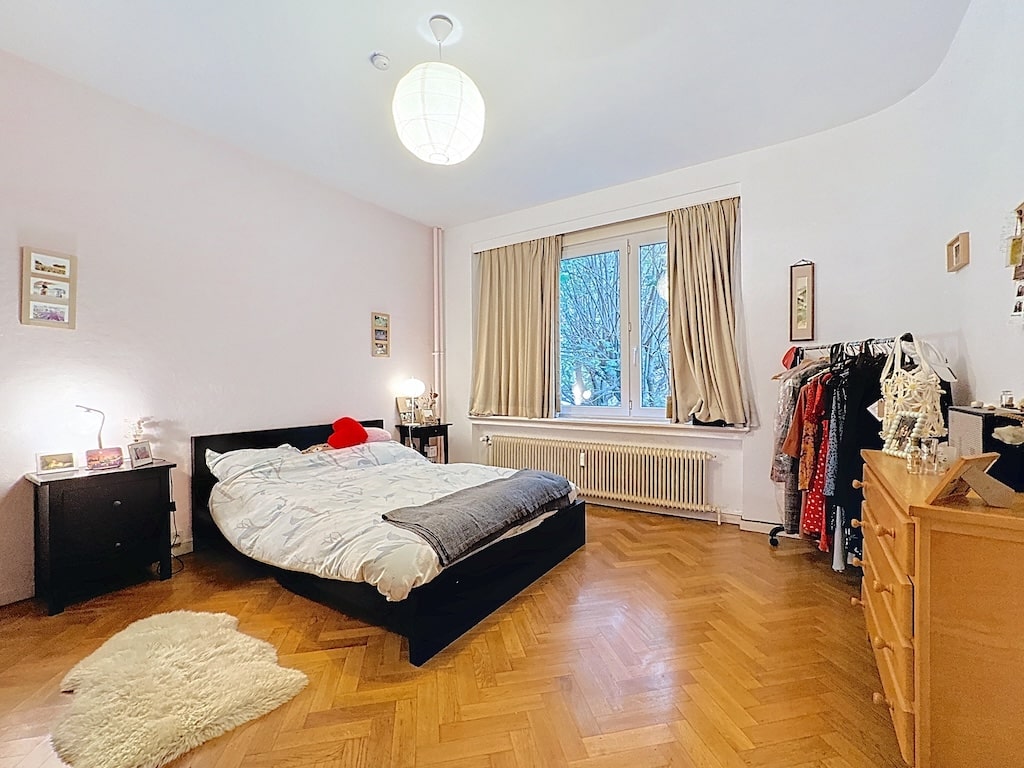 Une chambre chaleureuse avec murs roses un lit en bois sombre linge gris et coussins décoratifs baignée de lumière naturelle Un tapis blanc une commode en bois fin des photos encadrées et une penderie ajoutent du style à cet espace cosy et élégant