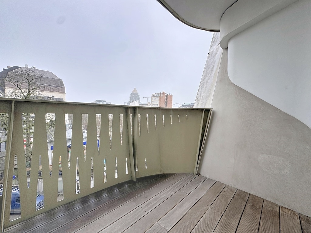 Balcon moderne minimaliste avec vue urbaine sol en bois ambiance douce sous ciel nuageux