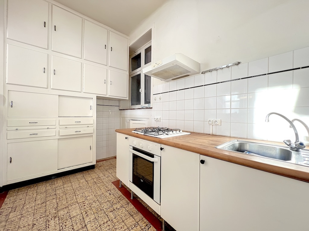 Cuisine moderne lumineuse avec meubles blancs plan de travail en bois évier en acier inoxydable cuisinière à gaz hotte simple sol en carreaux texturés offrant un espace pratique et esthétique pour la cuisine quotidienne