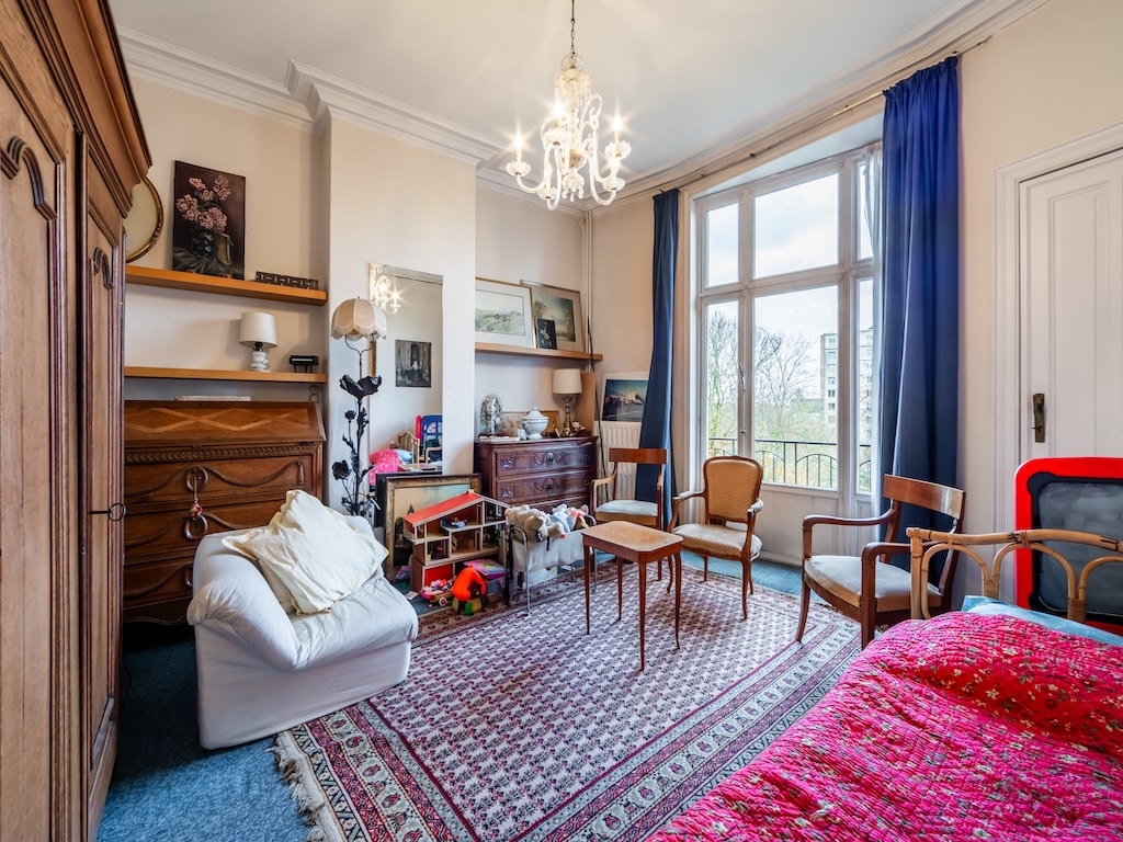 Un salon éclectique et chaleureux mêlant mobilier vintage et contemporain avec un fauteuil blanc un lit rouge un tapis coloré un mobilier en bois antique des photographies un chandelier délicat et une lumière naturelle douce