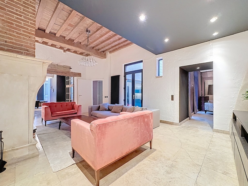 Salon moderne avec canapé rose velours poutres en bois et luminosité naturelle