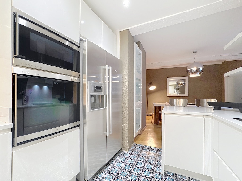 Cuisine moderne avec électroménagers en acier inoxydable carrelage coloré espace ouvert et lumineux