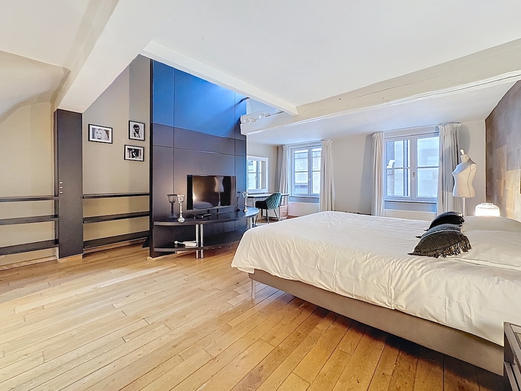 Une chambre moderne et chaleureuse avec un lit central au duvet blanc et plaid noir de grandes fenêtres laissant entrer la lumière naturelle un mur avec télévision encadrée de photos un fauteuil vert près de la fenêtre et un plafond à pente pour une ambiance accueillante