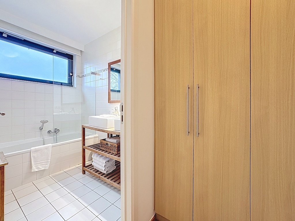 Une salle de bain moderne et lumineuse avec baignoire blanche rangements en bois clair lavabo élégant avec miroir et cuisine intégrée le tout baigné de lumière naturelle pour une ambiance épurée et chaleureuse