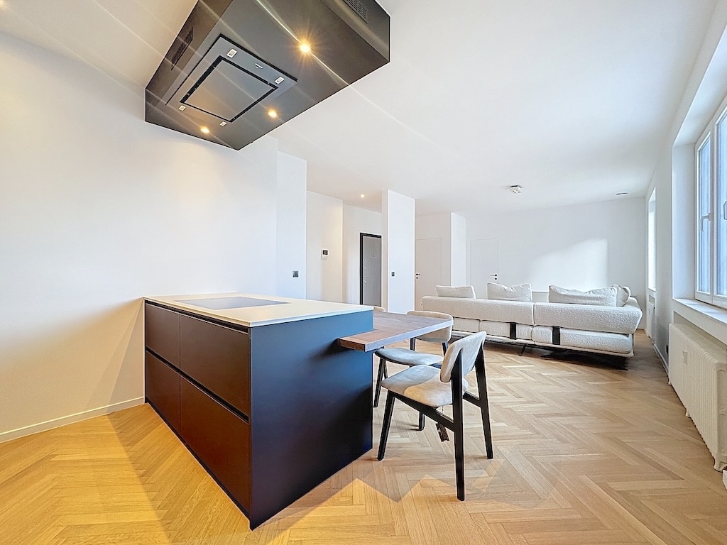 Salon et cuisine modernes lumineux avec îlot bois clair et mobilier minimaliste